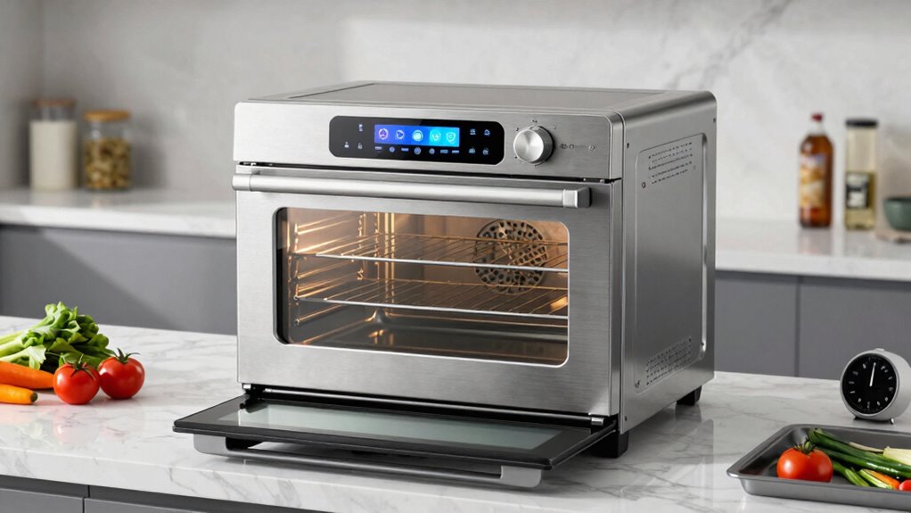 When choosing a countertop convection oven, focus on energy-efficient features like smart heating and eco modes that cut costs and reduce environmental impact. Look for quiet operation with sound-dampening design to create a better kitchen environment. Useful features include precise temperature controls, multiple cooking modes, and smart tech compatibility. These guarantee versatility and better control without sacrificing performance. Stay with us to discover more ways to pick the best model for your needs.